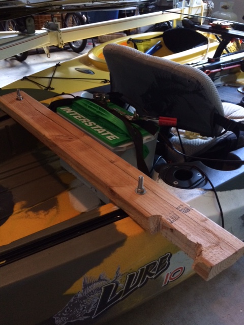 It's a very simple mount. Drilled two holes at the very end of the back tracks, took out the rodholders to access the hull, and threaded two bolts through from the inside. Added a nut to keep the bolts from sliding back into the hole and then put the 2x4 on top and secured it with a washer and nut. I also had to make a small notch in the wood in order to fit the motor onto the wood. The whole piece of wood is able to be removed when you're not using the motor as well so it doesn't get in the way of your paddle.
