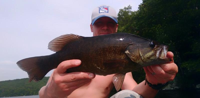 Got out again today on a different resi and the bite was still on. Saw 2 bald eagles hanging out before I ever wet a line knew it would be a good day. Smallies were chasing all day. Caught a few, lost a few. Nothing over 18" but nothing below 16"..... Got a decent pickerel too! Highlight was the 2 thick 18" smallies. Little bit warmer today but the clouds made it bearable.......