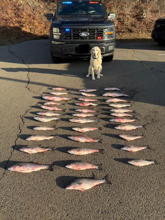 · On Tuesday December 17, 2024 two EnCon officers and K9 Luna were patrolling the Housatonic River for striped bass poaching activity. Officers located a group of six anglers fishing. As the officers watched, they observed an angler climb the riverbank, climb over the guard rail, run across the road, and enter a steep wooded hill side on the opposite side of the road, disappearing into the woods. The angler appeared to be carrying something heavy. After a few minutes the angler returned to the riverbank empty handed and continued to fish. Contact was made with the anglers, two had no fishing license. They claimed to have caught and retained no striped bass. K9 Luna was deployed on leash along the roadside and requested to search the wooded hill side. She located four separate bags of striped bass each buried in the ground and covered with leaves, the bags spanned a 75 yard long stretch of roadside. In total there were 34 striped bass, all ranging from 12.5” to 25” in length, in violation of the striped bass slot limit which is 28” to 31”. The anglers had 64 striped bass violations and two license violations. They were issued fines totaling $4,974.00. All fish were seized and donated to a non-profit wildlife rehabber. Connecticut Fish and Wildlife. |