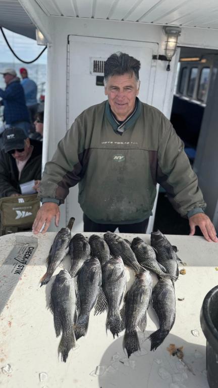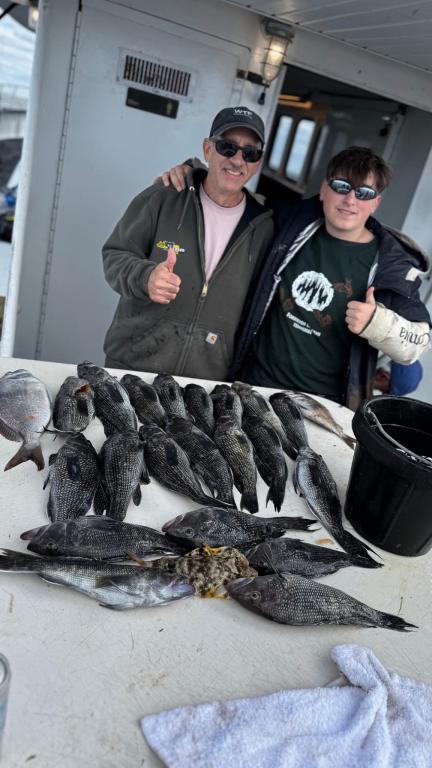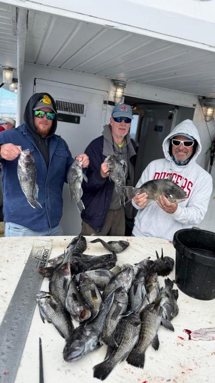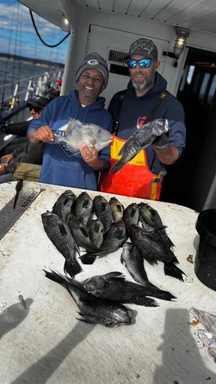 UPDATE - WE ARE NOT SHAPING UP TOMORROW. Hey gang, we had a nice crowd of customers today. A lot of the same guys that have been coming out with us. We had limits of nice big jumbo Sea Bass around the boat. The first drop we slugged away but then we decided to try a drop we haven't fished yet this year and glad we did. We had the fish flying over the rails. All big jumbo Sea Bass, big giant Trigger fish, big Porgies and keeper Blackfish as well as throwback Blackfish. Ben had one jumbo Sea Bass that we measured at 18-1/2 inches. Almost bigger than his keeper Blackfish. We fished with green crabs and fresh clams today. It truly was a great day of fishing for us. Larry and Danny have been cleaning for a while so I'll post pics in a little bit. We have a lot of these guys coming back tomorrow. So let's go fishing. Sailing 7:30 AM to 2:30 PM; fare is $90; free ice for your catch. Green crabs supplied and fresh clams also. Thanks, Capt. Scott