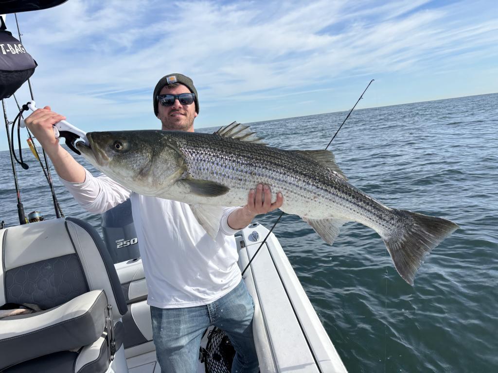 Wasted a few hours inshore on my Tidewater 232 Adventure in rocky areas with eels and slow drift conditions. Finally figured out they wanted floats set right at 20’ sitting over 21’ hump. Went 4/5. Got our smallest fish of 38” the rest 43-45” overs. Still slower than I wanted. Marking lots of bait but they were deep. Nothing in lures. Headed out just inside 3M line and saw fish blowing up in bunker. Stopped immediately and it was 2 hours non-stop on shads and live bunker. Hard to keep livewell stocked with snagging but we managed to keep up with supply and demand. All big fish - 44-48”. By 2:30 the bunker went deep (because bass stopped feeding, and headed back to port).