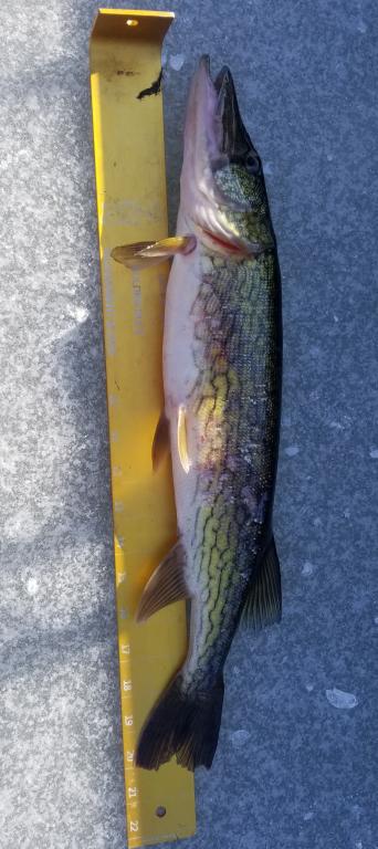 Drove around Sunday n found the last remaining body of water with safe edge/launch seems like. A slushy 5 inches Sunday (day temps in the mid 40s). Got 4 pickerel on fat heads. Jigged up a dozen panfish (mainly small blugills) with mealworms n waxies. Great time jigging!!
