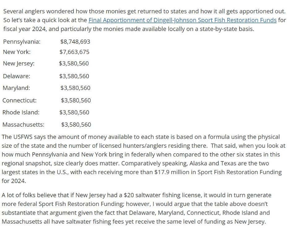 If it were any of several other states I would have much less of a problem with a SW license,however NJ?? NY??...Those funds would be appropriated instantly into the general fund and distributed back into programs and giveaways to buy votes from the welfare class, "working poor",illegals,as well as programs that are legit and might benefit seniors, disabled, etc.. Might sound noble and all but thats NOT where fishing license fees should be used.. also, I despise the idea of "" the artificial reef program"".Too easy for that money to disappear into thin air. A LOT, a real lot of fishermen don't use the artificial reefs,, that money should go to greatly expanded access for shorebound and working class fishermen that might tow a 14 footer to fish a bay or tidal river, and NOT have to pay $75 to launch.. THATS where those fees should go,, State run free or low fee launch ramps, municipal or state park administered fishing piers and dedicated free access fishing areas in tidal areas, possibly fishing access on highway bridges that cross tidal rivers and bays, such as we see down south, etc.. Won't happen here, that money will go right to the cities where it will be used for ""social programs"" that are designed to catch voters, not to help anglers catch fish.