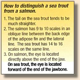 With salmon the eye is right in line with the end of the jaw bone, on trout the eye is much further forward. It was caught in South Bound Brook, not far from tidal waters.