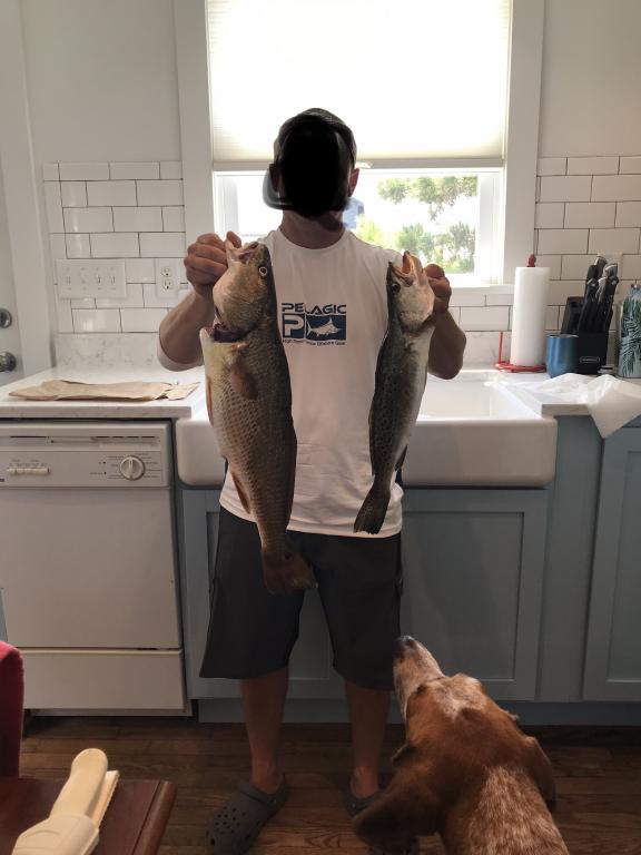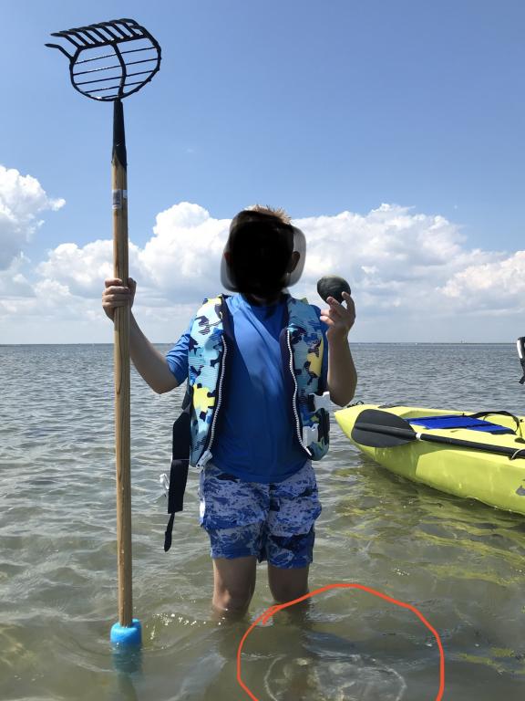 Son and I filling a basket of clams 25” kayak fluke OBX redfish and trout for family dinner Early September season Pope & Young |