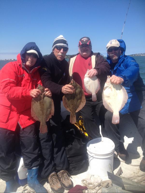 Today's trip was about as good as it gets! Excellent weather and big flounder limits in a trip cut short by "too many fish"! We could have been limited out in less than 2 hours but we kept increasing the minimum size to make it last. Even the small fish were BIG! As it was, I could barely close the bags of 16 fillets each (8 pounds of fillets). These were men who live and fish in Montauk, NY and they were giggling like little school-girls they were so tickled with the fishing and many fish in the 17-19 inch range!!!