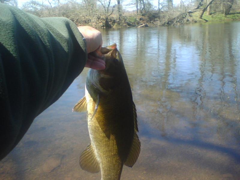 Since last Friday worked out with a nice SM I figure why not make it a regular Friday lunch thing. Water is still up a bit and running fast and cold. Pretty sure all of the NB stockies are in the bay by now! So again 1 minute drive 1 hour of fishing and 1 nice smallmouth and again on a Ned Rig green pumpkin TRD. And again a crappy flip phone Pic of the little piggy. I gotta start bringin a camera but I figure if I do I'll never catch another fish!