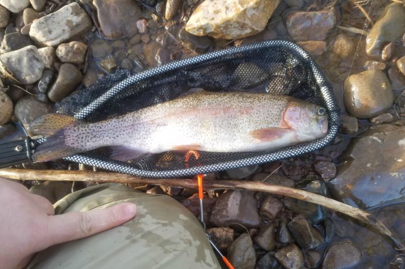 I decided at first I would do a bit of walking in hopes to stay away from the stockies and find thmyorke1 and myself a nice looking hole in hopes of hooking some holdovers. We got off to a bit of a late start and we ended up with a nice bow (the only fish pictured being held) before the sun was directly above us and the bite turned off. Good reminder that mid day isn't the best time to go trout fishing. With that in mind I got an early start the day after the S.B was stocked and fished the best spot i could find close to a stocking point,but without being visible. Hooked up with a fighter, immediately shot down river taking drag (must admit I thought I hooked a carp) fought it for a couple of minutes before it came shooting out the river and was obviously a nice trout. Kept it out of a downed tree that was close by and some how got her into my net. Was another nice bow with some decent weight to it. Sorry for the pic she flopped out of my net onto the ground. I took the pic and got her back into moving water right away. She was worked back into shape and darted off in less then a minute. Next trip I decided I would try to find the stockies. So I moved down river a ways to a hole that had produced many in seasons past at that exact time of year. Fished it with no luck! Being convinced that there were fish laying in there I returned late evening. Same thing no luck. I changed up the way I fished the drift about 40-50 yards walking down stream keeping closer to the bank. Bang! That made all the difference (fishing bait) landed more 18" to 20+" bows. Still have not seen a stockie?? All fish were pictured, worked back, and released. I hope May brings a good quality of fish as April did, but I wonder where the stockies are?? |