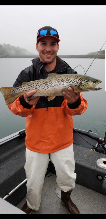 Rainy morning at RV but managed 4 rainbows, a big perch and a beautiful tagged brown. Brown taped out at 25", didnt get a weight on it but figure around 6lbs. Kept the fish in water other then to take a few pics. Removed tag and released fish healthy. Fish was stocked 2 years ago at 10 inches, guess hes been eating good since!