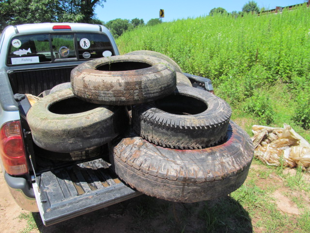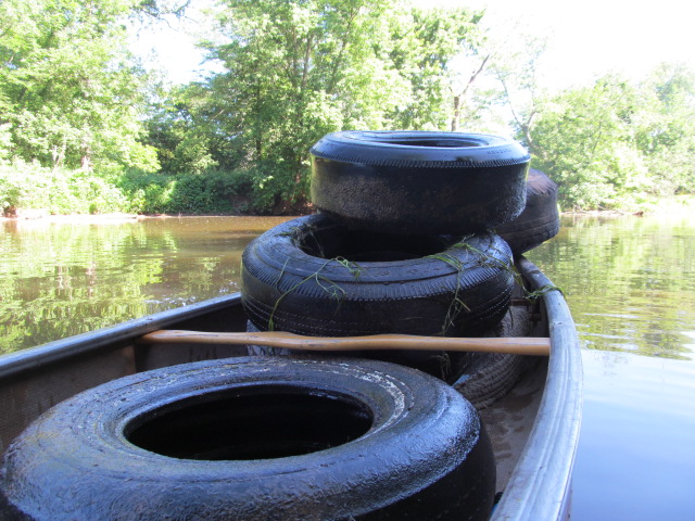 I had CJST lead man Jens with me. We made a pile at the confluence then Jens had to leave so I took a short ride up the North Branch, it looked pretty good. When I got back to the take out spot there was a Spanish speaking family there with kids and kayaks getting ready to launch, and the pile of tires and trash was GONE ! I asked the family if they saw a pile of tires and trash, they said yes, we threw it all over there in the deep weeds because we thought someone had dumped it there. Good thing they were still there because I made them get all the tires and trash that they moved. What is it with people ?