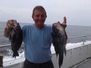 Even though we had some rain today, we had EXCELLENT SEA BASS fishing again. There was plenty of action and we easily made a boat limit. We have an occasional small BLUEFISH being caught on a jig and hopefully any day now they will move in. But in the meantime, we are catching some really nice BIG SEA BASS which makes for a great day of fishing.