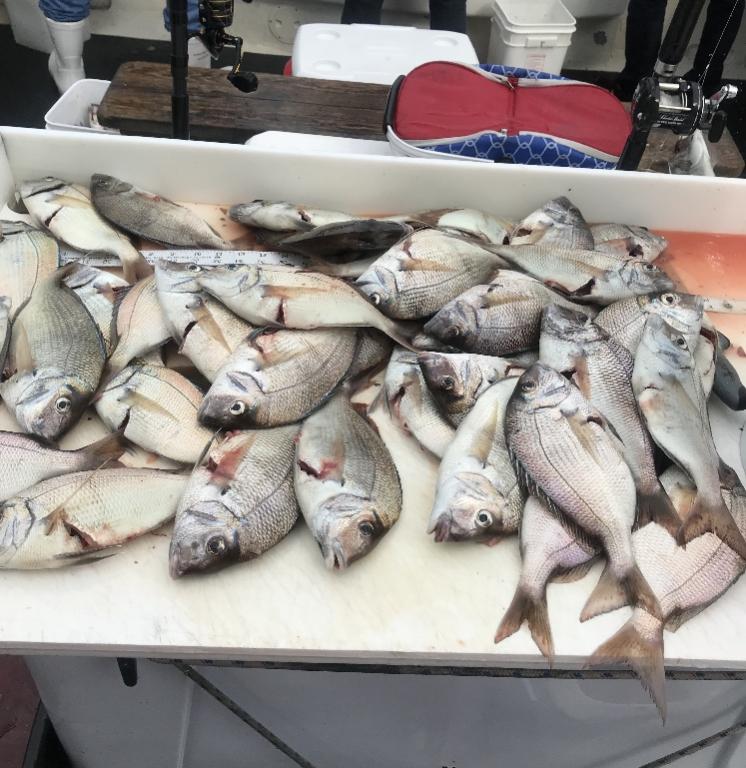 Sunday we ran another 6 am Jumbo Porgy trip with a big crowd of great new guys, gals & kids. Drop, reel, repeat. In short order, everyone got what they came for and left with big smiles and bigger bags of iced fillets. The end. Back at it Weds. Thanks everyone for sailing with us and all others who continue booking all their Jumbo Ocean Fluke, Porgies, Triggerfish, Ling and bottom dweller meat trips going forward at a rapid pace. Don't miss the next open boat trips to catch yours in comfort, like a gentleman -