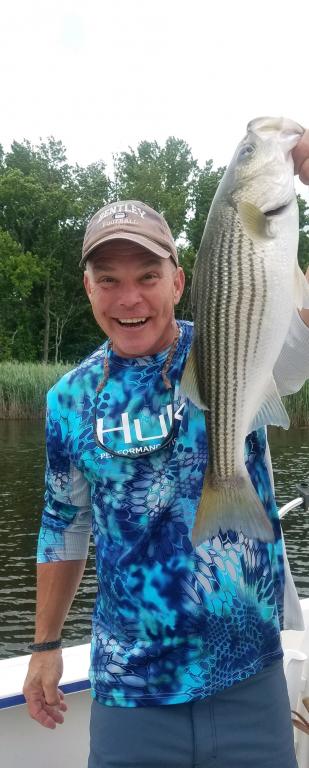 Crossing the bridge I could see the white caps in the angry bay ..... OK...PLAN B. I knew we had a good afternoon flood tide for the creek with the East blow and continued to the boat with Andrew and Scotty. With the creek absolutely loaded with peanut bunker we took advantage and one throw of the net gave us the live bait we needed. We fished the wonder rigs with live peanuts and had good action with fluke to 4lbs. Ended up keeping 4 nice fish and releasing a bunch of shorts. While drifting one of the holes Scotty had a crazy run off that snapped his 12 lb leader .... drag was screaming pretty good. Initial thought was a snag but I was not buying it. Had the guys put fresh livies on and I went back for the same drift..... BANG.... two rods bent over.... ended up that we found a concentration of schoolie stripers under the peanut bunker. Played around for a while with good catch and release striper action. Nothing big of course but great fun on light tackle. After about 2 hours the winds really kicked up and the rain kicked into full gear chasing us off the bite. Ended up being a really nice trip close to the dock. |
