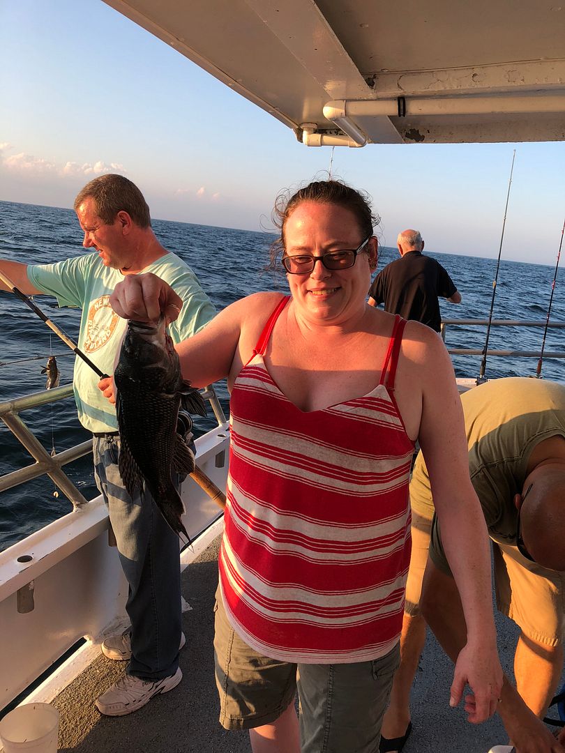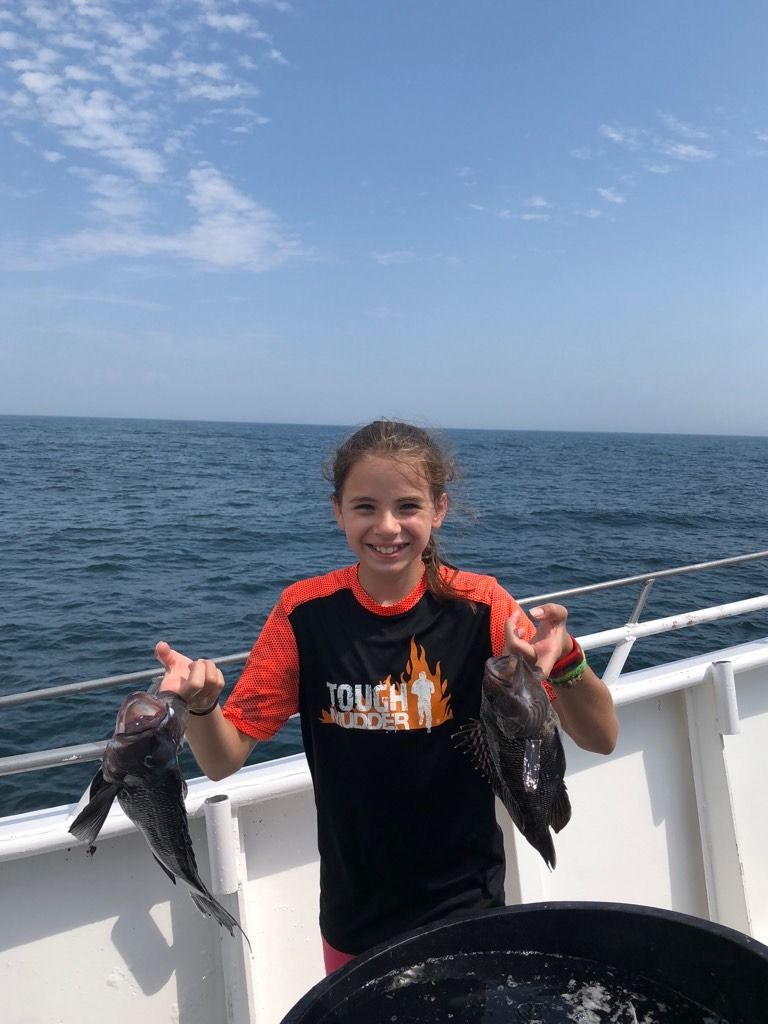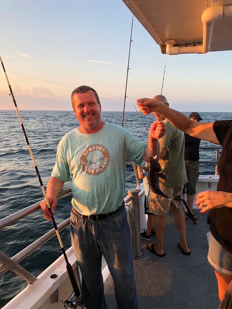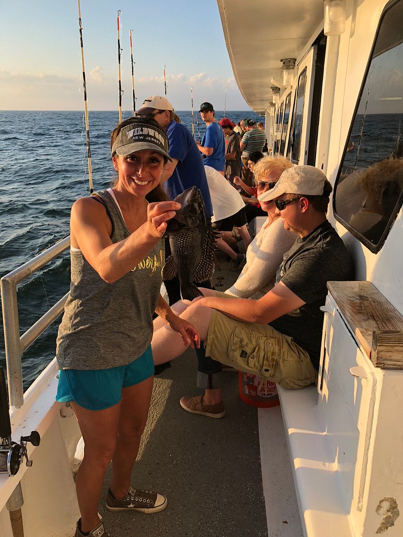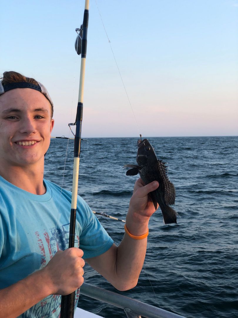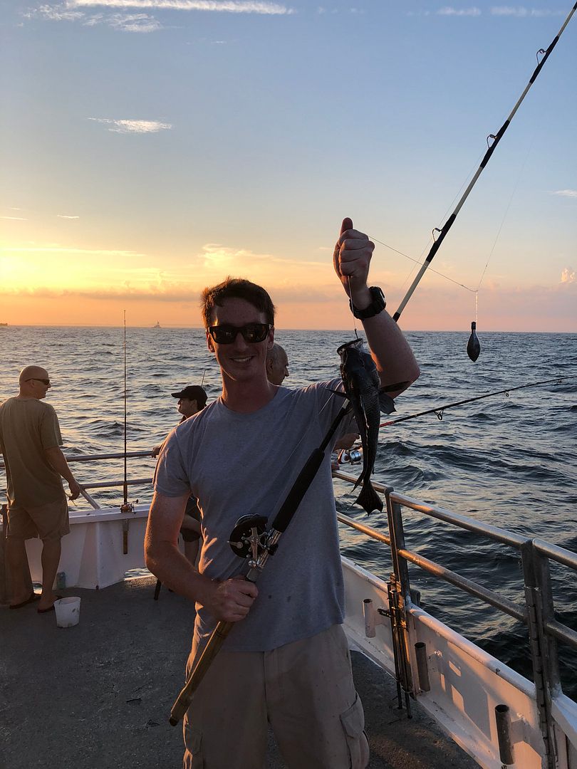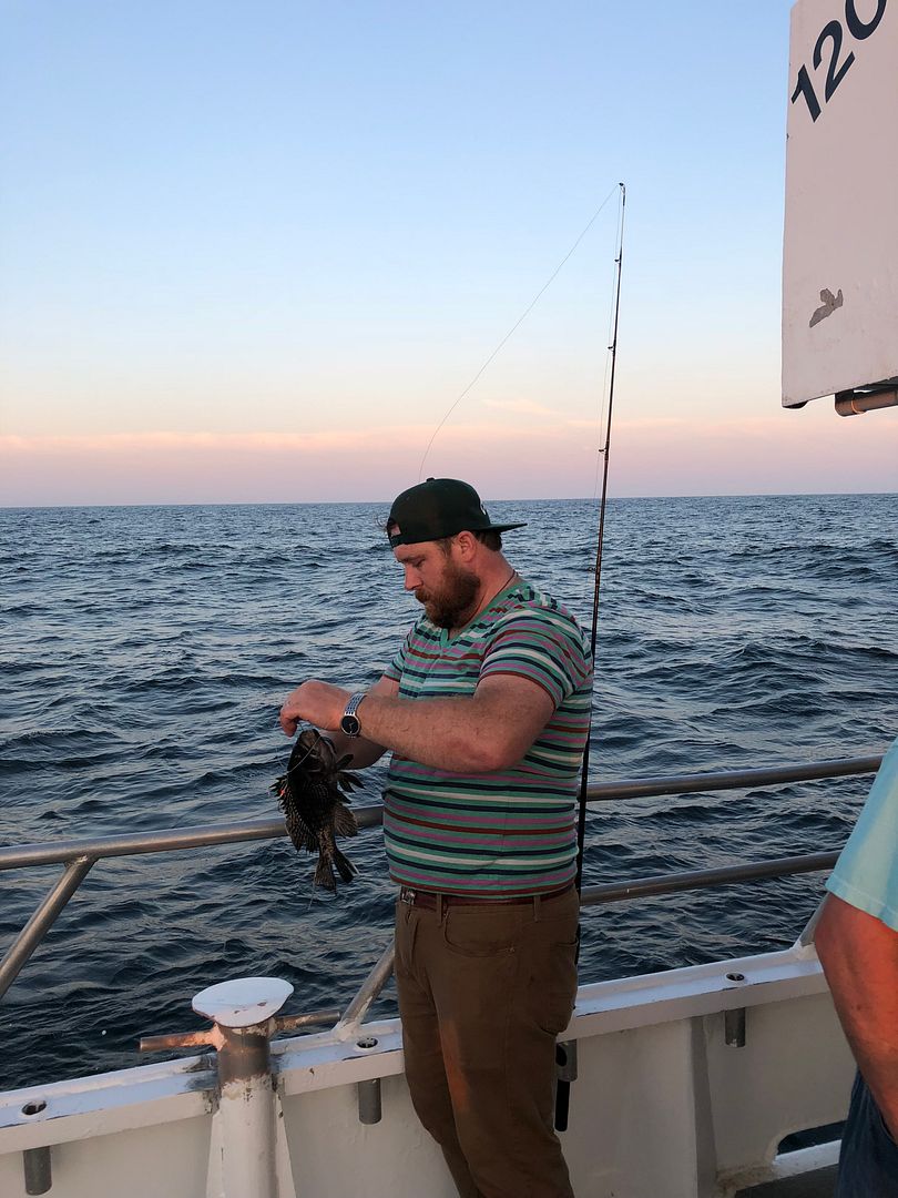 Thursday afternoon, the weather finally cleared up for us to get out and do some fishing! We caught plenty of sea bass with a good mix of keepers and shorts. We also caught a few ling and fluke mixed in. By the end of the night, the water was nice and calm and it was a beautiful evening with a picturesque view of the sun setting over the ocean.
