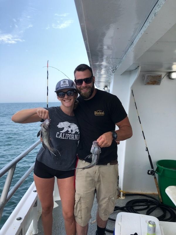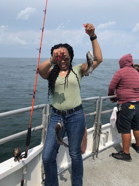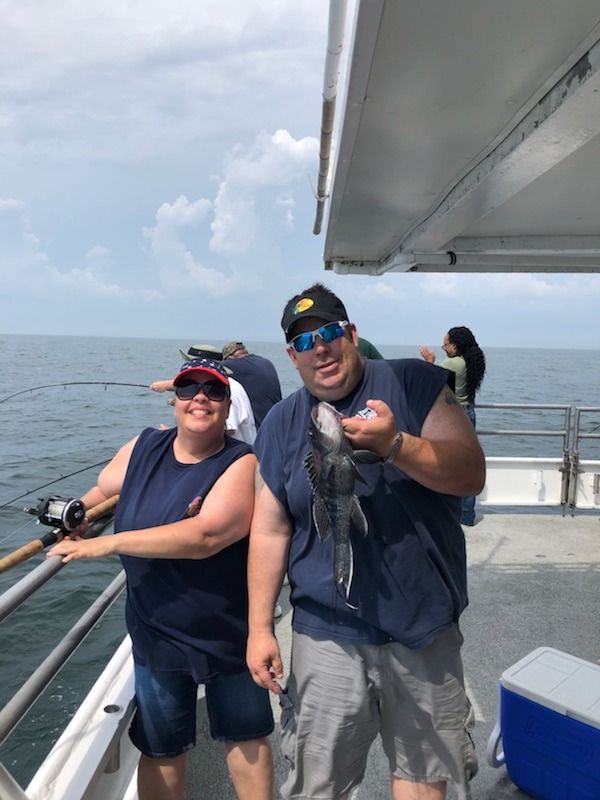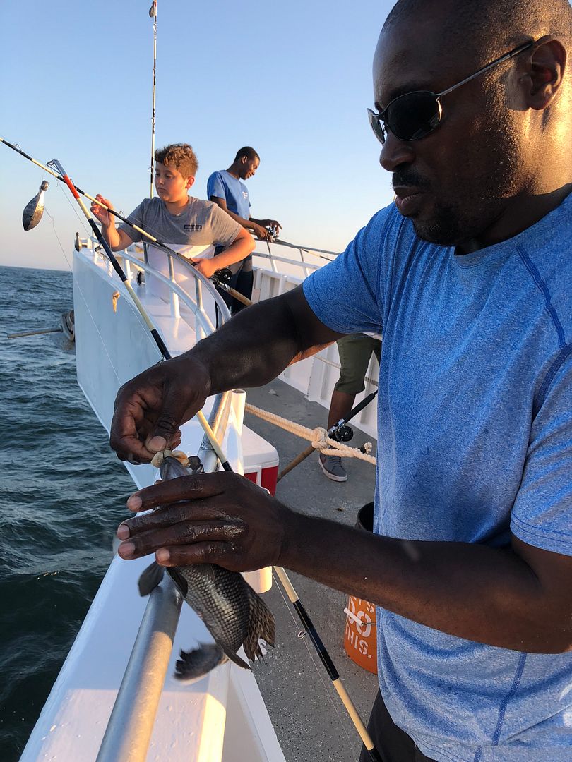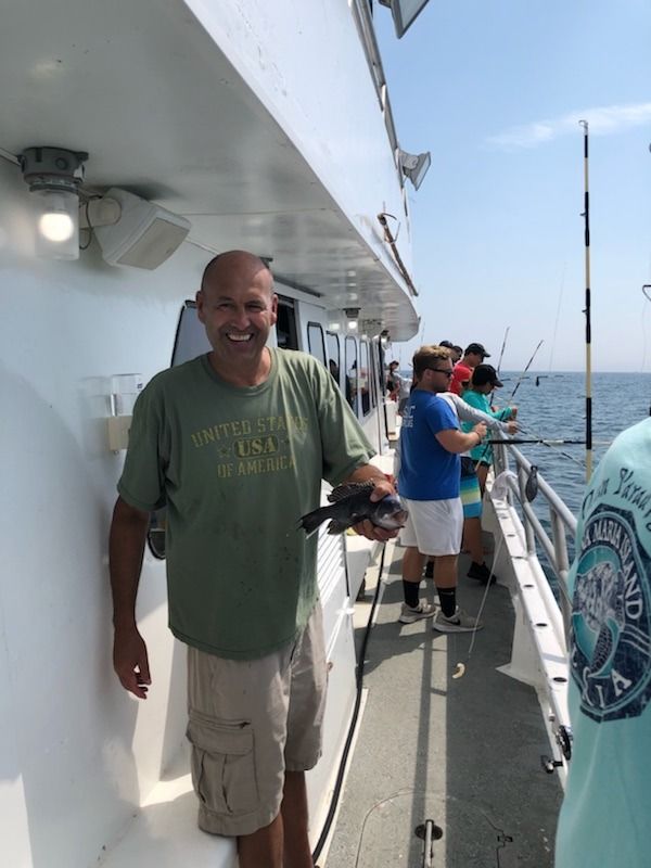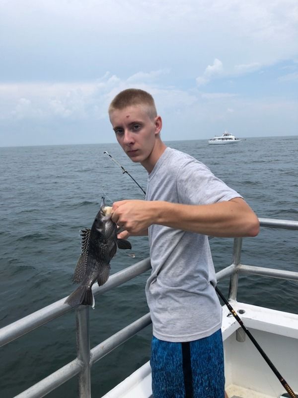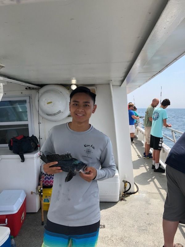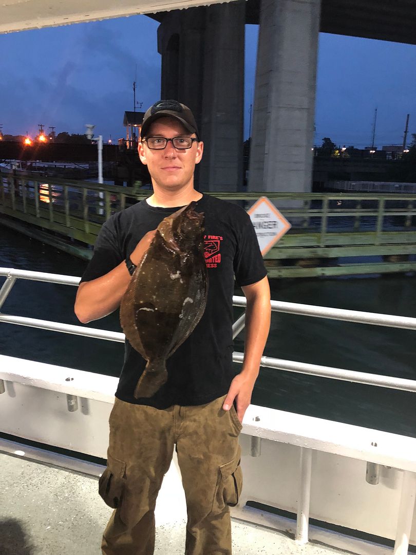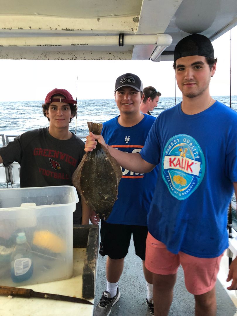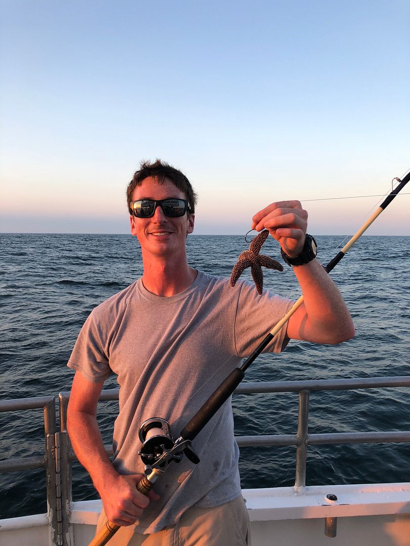 Thursday afternoon, the weather finally cleared up for us to get out and do some fishing! We caught plenty of sea bass with a good mix of keepers and shorts. We also caught a few ling and fluke mixed in. By the end of the night, the water was nice and calm and it was a beautiful evening with a picturesque view of the sun setting over the ocean.