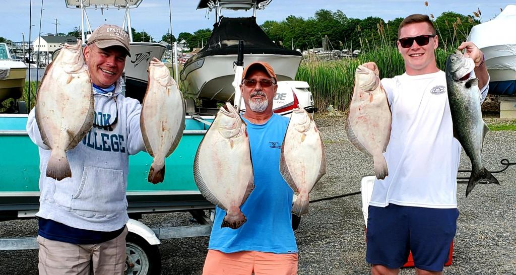 Sunday.......PERFECT CONDITIONS ..... Had to fish quick as I only had a two hour window. Had the perfect tide timing and wind giving us optimal conditions to catch the Summer Flundies. We only kept 4 but had the action the whole time and left them biting. My turn for the pool fish at 22 inches also on the WR...