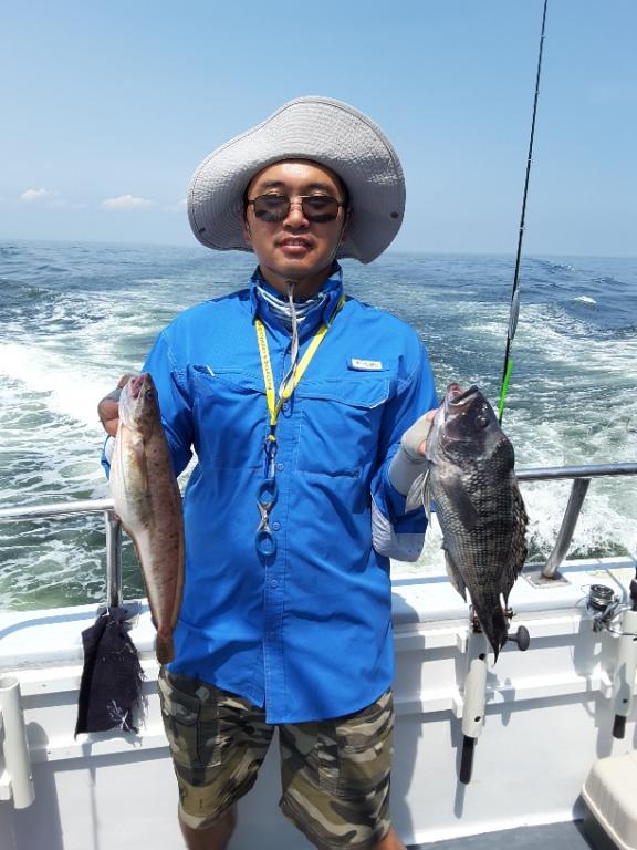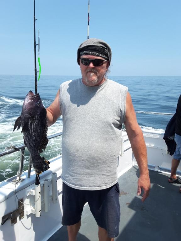 This morning there were BLUEFISH all over the place. They were breaking water, they had birds on them and they were practically banging into the side of the boat splashing around. They were hard to catch but we did catch some and they were all on jigs. They disappeared around late morning so we went off to the SEA BASS grounds and picked away at the SEA BASS with a couple LING mixed in. Overall, it was a DECENT day and the weather was absolutely beautiful.