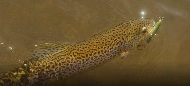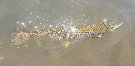 The fish just bull dogged with a series of short runs and a few big head shakes but thankfully stayed down and didn't jump or go crazy. Eventually the fish started to tire and i was able to slowly work the fish and myself over to the bank. As I worked to the bank, I took a quick video of the fish as I knew with Penny on my chest, I probably wouldn't be able to get a good picture of the fish once landed. I also don't bring a net most of the time I am wet wading so I knew landing the fish would be challenging. I managed to bring the fish to the bank quickly pop the lead treble out the fish’s mouth. I keep a small flexible measuring tape in my pocket and with the brown in the water I taped it out to somewhere right around 22” I didn't want the take the fish out of the water any longer then I had too.