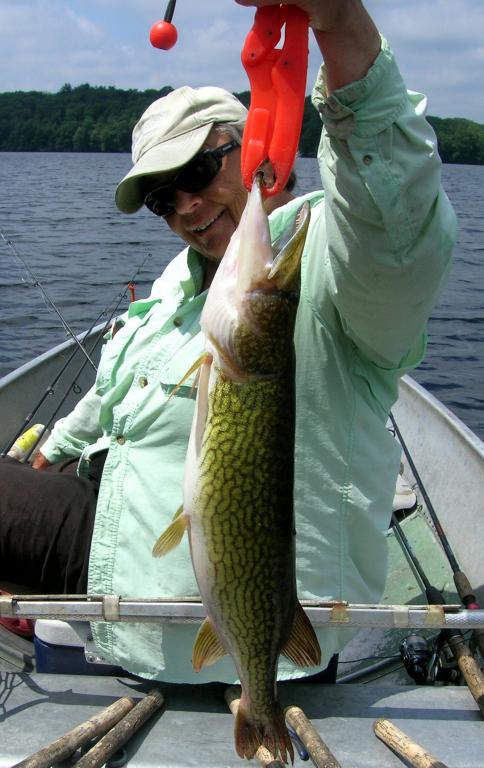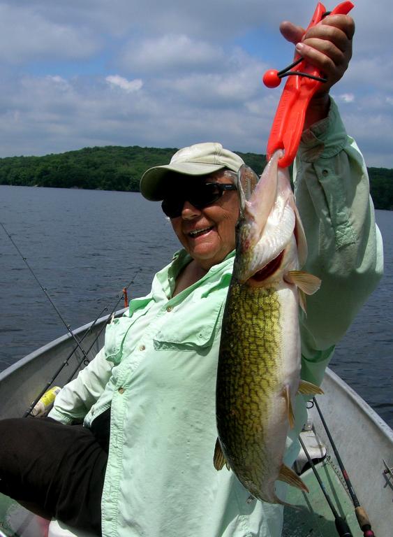 Went to a ressie from 10:30 to 2:30 and did more netting for the better half than catching myself. We prefer fishing where the pickerel numbers are few but sometimes you have to bite the bullet and deal with them. There a good chance of catching a big one or two every time you go but today was memorable in a couple of ways. My better half caught 6 pickerel, a few SM biggest 17" and lost a nice LM at the boat. What was memorable was that four pickerel were 24" and thick, one was 22" and a 20", they all gave a great fight but when they came up to the surface four of them exploded about 2' out of the water. They will jump on occasion but I've never seen it to this degree. I caught a 24" too, making five cookie cutters lol and lost a few small SM. Took a picture of two of her pickerel and a SM.