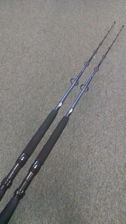 Calstar 7' 30-80lb Grafighter blanks. Black wraps, bluefin decals, machined aluminum reel seats and gimbals. Ring-locked guides with 50mm gathering guides. $375 each.