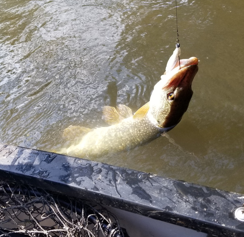 Also a neat thing was that we chatted with an angler walking the banks. He was using a jig with a chart grub He told us how he got bit off even using heavy mono (like 20-40) when we resumed fishing just downstream i catch a pike and net it. We both see in the net a chart grub n jig, same size, with heavy mono attached. I believe nick still has it. We wil have to return it to the man we saw LOL ![]() The river is really fun at low water. Most of the banks are clear of the annoying plants, just trees and bare ground half the time. |