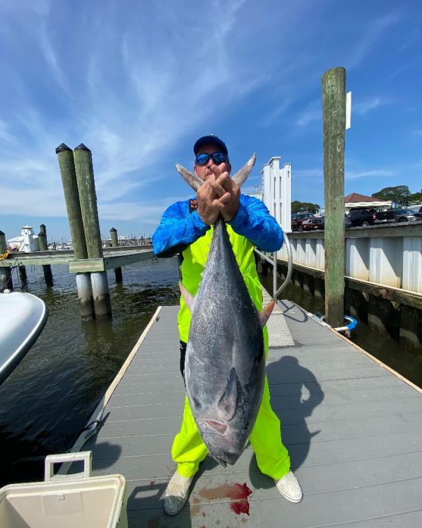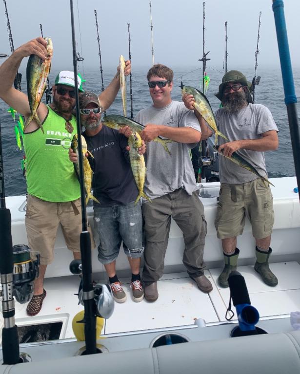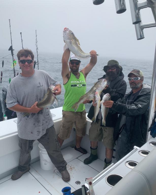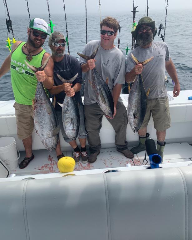 On a super foggy day. Stopped inshore and got 3 yellows and A bluefin, got tired of trolling in fog so we made a sprint to the Canyon got our first mahi of the season getting a half dozen then Dropping In for tiles getting some nice ones to 15lbs. What made this Trip a good one was Orion’s brothers had never caught any offshore Species. On way home found some more bluefin to end the day. Capt Craig hosted regulars Manny and Jeremy on the 31FA and with The thick fog they opted to stay inshore worked hard Landing a 45 inch bluefin.