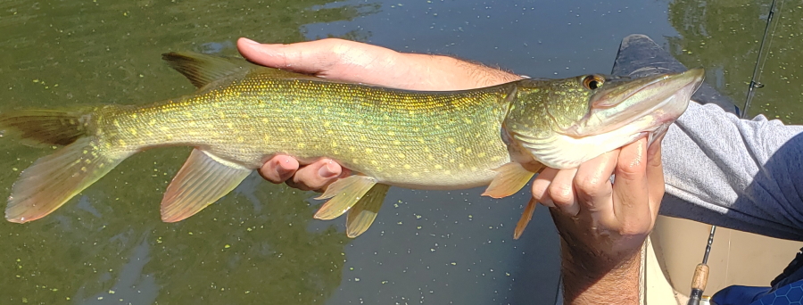 a pike-pickerel hybrid (?); looking for input on this, never saw one before, is it a hybrid? it fought the wildest out of any fish the whole day. jumped and flipped clean out of the air twice like a tarpon.