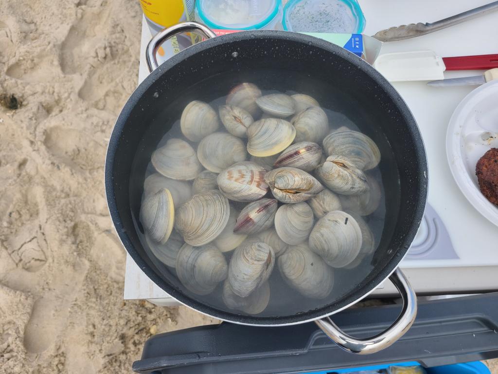 Did a late summer clamming trip with family and friends. Had a good outing with over 4 dozen clams caught in a short amount of time. All clams were nice size and clean. Water was a little chilly, but we got used to it. We then drove onto the beach and my friend, who is a chef, made an amazing clam risotto with our catch. An awesome day on the Jersey shore with family and friends
