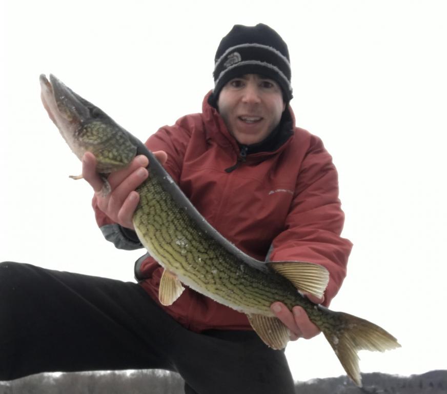 Same story on the big pond yesterday, it was pretty slow and didn’t see much chasing of flags by the guys around me. Nothing on the jig rod, but I did manage an average size slime dart on a tip up. Then as I was collecting my stuff to go home I got another flag...and slid a ~25 inch pickerel through the hole.