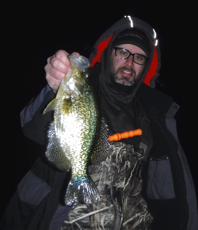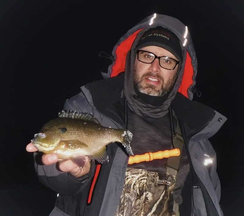 after the snowpocalypse some places were just so sloppy, it was annoying to walk around far.... some places got partially ruined. we hit up our early season first ice spots that were not as sloppy and partially hardened snow on top of 7" of black ice. unfortunately we were welcomed with a slimedart festival and no big ones. we waited it out til the crappie came through at dusk and intercepted them a bit and even had a saucer sized bluegill join the party. I used squatch's headlight to charge my glow jig right before nabbing another skillful angler gill.... just thought i'd throw that in there ![]()