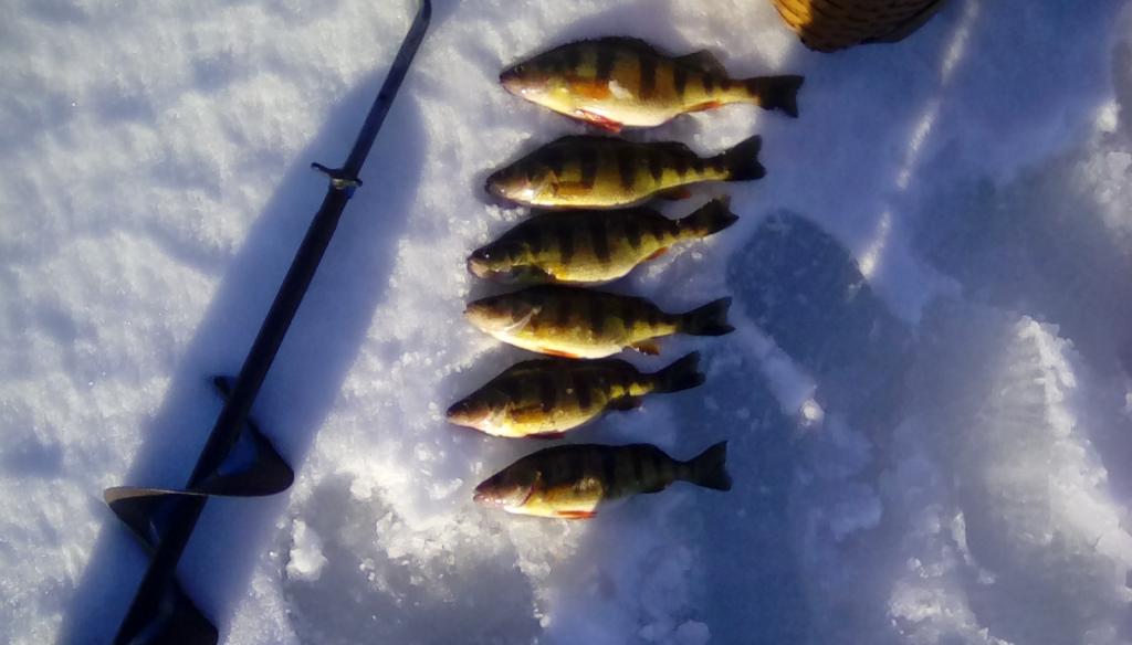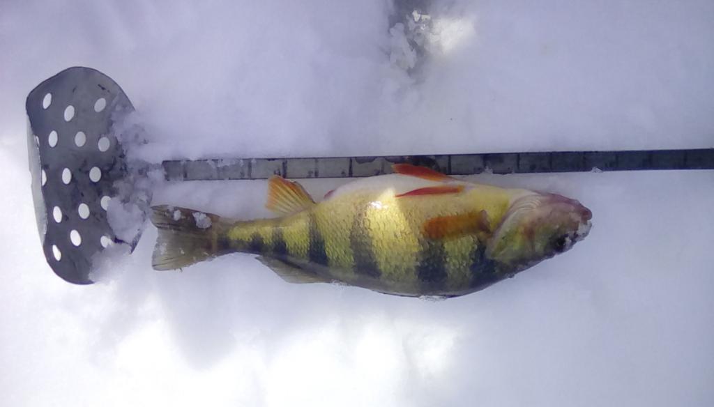 I went to a place that i love to ice fish now and spent many hours at as a kid fishing the open water, the" ROCK" as we know it. I got there about 9:00am and walked out from the parking area by those plastic docks that the state put there and saw grey looking areas on the ice. I drilled a hole in one of them and found that the ice was only 5" thick, 4" of black and 1" of white snow ice and thought oh no this is not good. I went to the cove on the right by what we call level rock and drilled another hole and found the ice to be 11" there 7" black and 4" white snow ice so i stayed close to the shore and headed to my spot. I got to my spot out by the big island at 11:25am. I took my time getting there checking the ice as i went. drilled 9 holes and found the fish in the third one in 23 fow the fish were on the bottom as usual. started with the rippin rap and it was not long before i got hit by the biggest perch of the season a 13" fish. Moved two holes away from that one and it was game on, i got 5 in that hole and had to move one more time and got 2 more smaller perch that i let go then around 4:15pm the fish stopped hitting and i headed back to my truck. If anybody goes there be careful that ice is going to melt fast and the back is probably going to be the only safe ice after the warm weather and rain that we are going to get this weekend. I really love that place so peaceful to fish at during the ice season no googans all over the place. (sorry for the upside down perch shot i do not know why that pic came out like that)