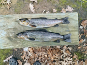 In late October, I went on a trip with some buddies to the Poconos. We only went out fishing for one afternoon, at a small stream called saw creek, but we did well for ourselves! I caught my first ever brook trout, which I released in about a minute after a quick photo shoot, and we bagged two browns for dinner! All three were caught on Mepps spinners.
