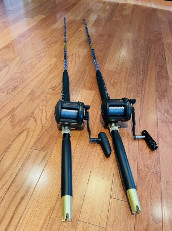 Reels are loaded with 100# braid and 80# mono. Rods are brand new Okiaya roller guide 5’6” stand ups. $400 for the pair.
