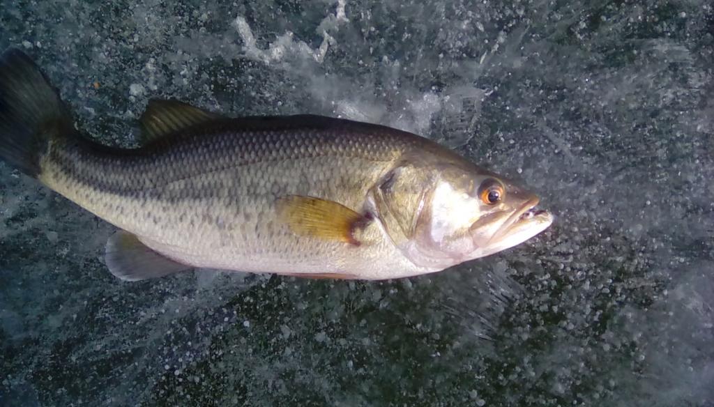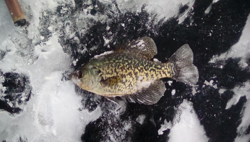 I went out on the cong today and found the ice at my first spot was not in good shape. the rains and warm temps have taken a toll on the ice. The shores are rotted about 2ft out . the ice eaters and the open spots that the birds are keeping open have gotten much bigger making it not safe to go out. Off to spot #2 and the ice there was in much better shape, it was 7" and in a sheltered cove that froze before the main lake. The shores were good on one side but not the sunny side where the rot has started. lets hope that the next couple of nights of cold temps will slow down the rot and you can get on. I was able to get 1 largemouth, 1 crappie, 1 perch and 14 sunnies fishing in shallow water. I hope we can get a couple more days out before the dreaded ice out period starts. I am at 26 days today and would like to at least get 30 days in this season, a short season is better than no season. DEFINITELY USE A SPUD BAR AS YOU GO IF YOU ARE NOT SURE HOW THE ICE FORMED. there are a bunch of cracks and fissures that are getting sketchy to say the least. please be careful if you go.. Farther north you go the better the chances are the ice is in better condition. I included two photos of the bigger fish from today. the perch and sunnies were small ones. all fish were jigged up and still swimming in the big pond.