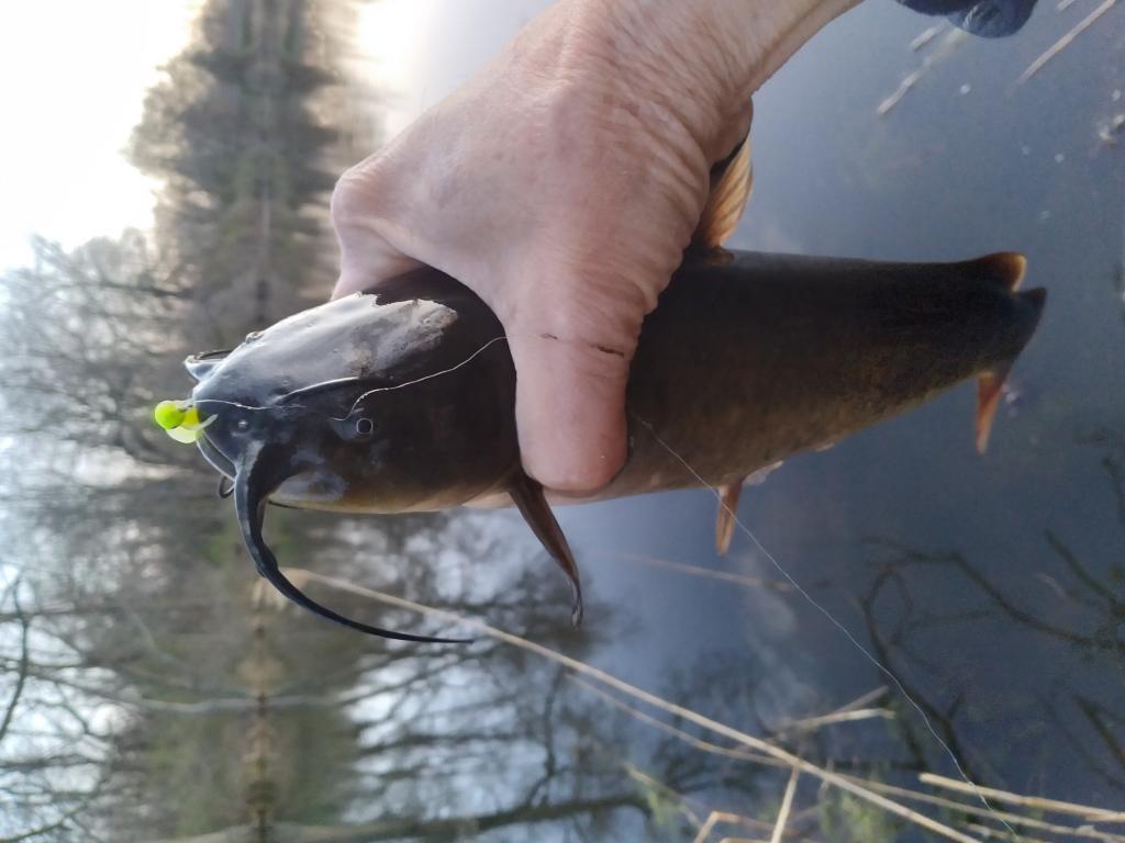 Caught and released 7 largemouth bass to 17”, 2 black crappies, 2 bluegills and a 13” brown bullhead with 1/32 oz leadhead jigs and twister tails on 2 lb test line in 58 degree flooded Sturgeon Pond this evening on a warm, sunny day with a light northwest wind. A beaver arrived late in the day. Got green slime algae on my lure on nearly every cast. Have leaks in both legs of my LaCrosse neoprene chest waders. Took lots of pics.
