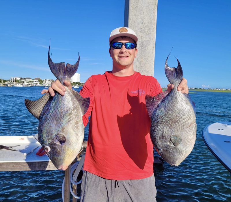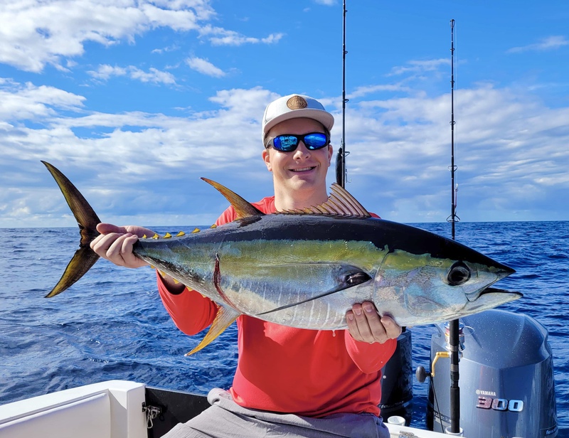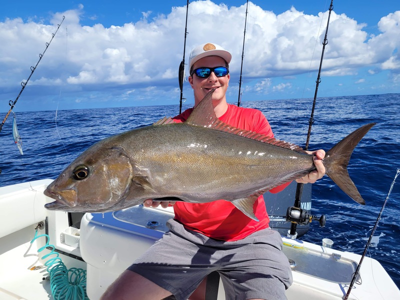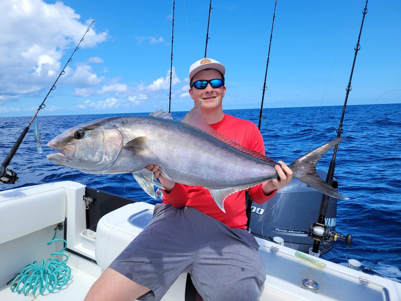 Nick and I jigged up amberjacks and almaco jacks until our arms, literally, couldn't handle much more. Nick reeled in his first tuna as we trolled a lure out moving between spots and also caught a double of the two biggest trigger fish i've ever seen in my life! fighting them both at the same time on a double bait rig we basically thought he had a small amberjack on haha. we also caught some various snapper (not pictured) and lost a few battles with some strong, hefty (probably) grouper. we each got pulled into a snag once and then i tightened my drag and got the next one up into the safe zone, only to have it take a hard run and pull the hook ![]()
