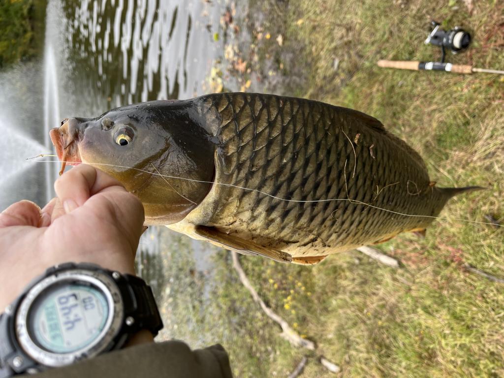 Who can guess what time I caught this fish? The Chinese takeout lady didn’t know. Lol 😂. Caught an 8.5 lb common carp with ShopRite canned whole kernel corn on a #4 long shank gold hook and 12 lb test line in 64 degree Colonial Lake this evening. Gave it to Rana and his brother from Pakistan for halal dinner tonight. Landed 59 carp this year. Also caught and released 9 bluegills and 7 golden shiners a day before Hurricane Ian.