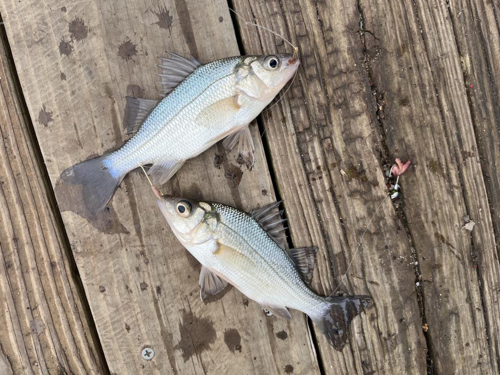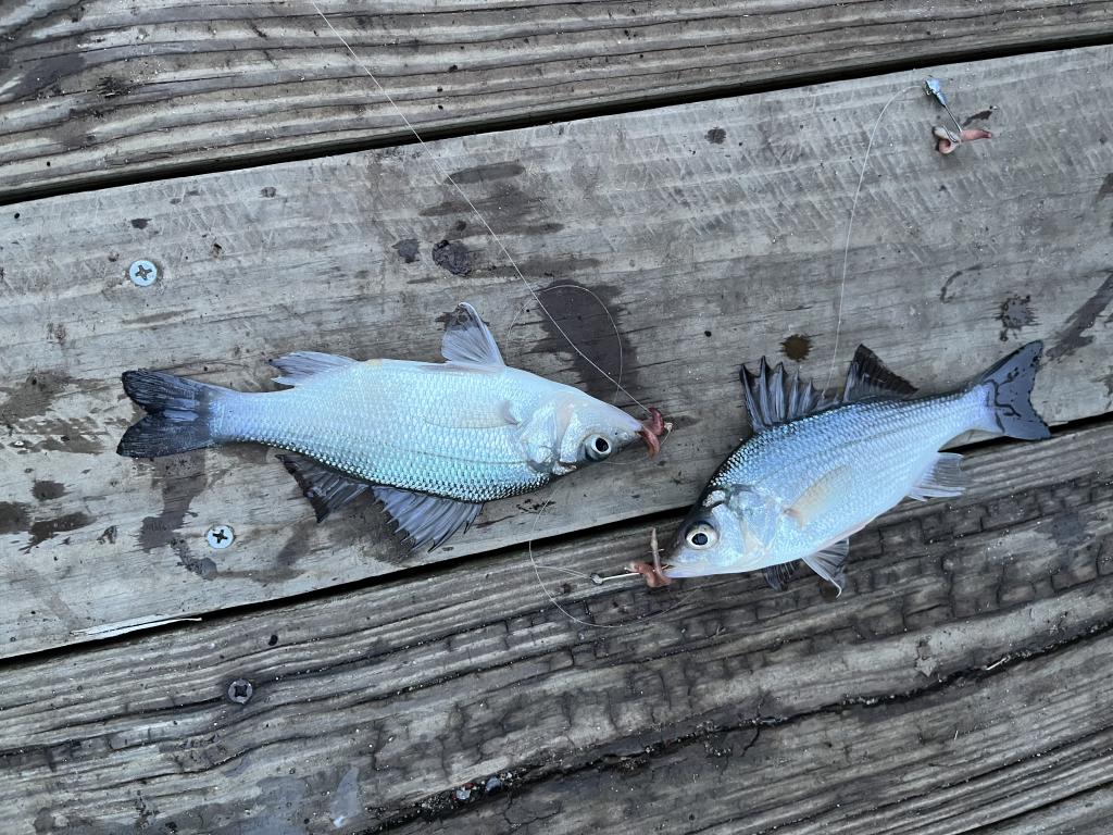 Went ultralight jigging in a 48 degrees NJ lake this afternoon on a warm, cloudy day with little wind and an approaching thunderstorm. Saw 10 other fishermen catch lots of perch, crappies, largemouth bass and a golden shiner. The bass hit shiners under a bobber. Most anglers were ultralight jigging. A few fish swirled. I caught a large tree branch from the bottom of the lake. My top double overhand knot slipped and the loop disappeared. I’ll tie a new rig tomorrow. My 60 year old 4 lb test monofilament line is still very strong. Saw Canada geese, mallards, mergansers, gulls, great blue heron and an adult bald eagle flying. Caught and released 23 white perch including 2 doubles and 7 yellow perch with Walmart red worm halves on two gold hooks and a 1/16 oz unpainted leadhead jig on 4 lb test line. Landed 305 fish in 8 NJ freshwater fishing trips this year. I quit early after the thunderstorm arrived. Lightning is very scary and dangerous. The last two fishermen also quit before I drove away.