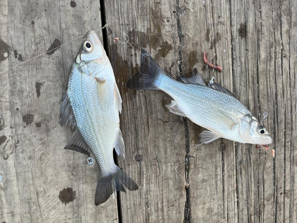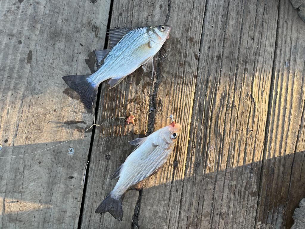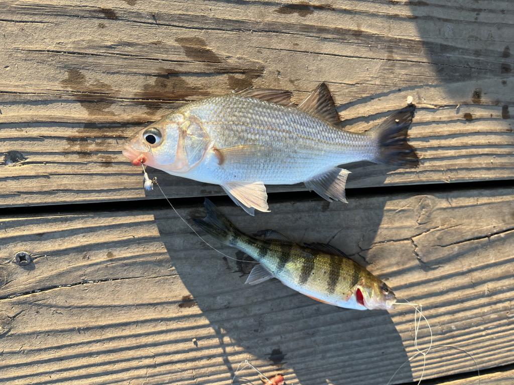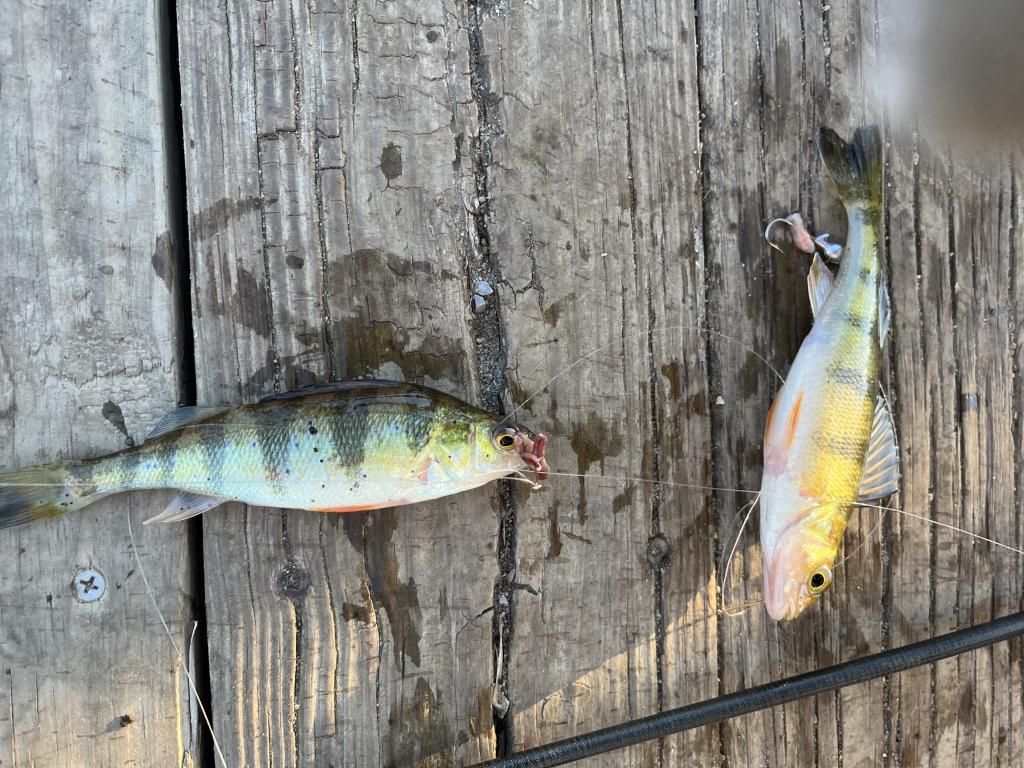 Went ultralight jigging in a 40 degrees NJ lake this afternoon on a sunny, cold day with a nor’wester small craft advisory. Air temp was only 38 degrees. I wore gloves but still got very cold. The parking lot was nearly filled when I arrived. More than 20 fishermen were there. I caught and released 21 white perch and 15 yellow perch including 5 doubles with Walmart red worm halves on two gold hooks and an 1/16 oz leadhead jig on 4 lb test line. Landed 3 different kinds of doubles: white perch, yellow perch and one of each. Caught and released 375 fish in 10 trips in the same spot this year. I’m still using my second container of 30 worms.