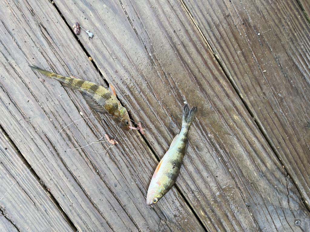 Went ultralight jigging in a 43 degree Central Jersey lake early this afternoon before an impending rain storm. Air temp was 40 degrees. Only one vehicle was in the parking lot when I arrived. A guy from Staten Island, NY, who didn’t understand English, saw me catch some fish. Landed and released 12 yellow perch including a double and 5 white perch with Walmart red worm halves on two gold hooks and an unpainted 1/16 oz leadhead jig on 4 lb test line. Quit fishing early after the steady, heavy rain arrived and my hands got very wet and cold. One of the regulars who fishes there every day arrived as I was leaving. Used up all of the worms from my second container for this year. Caught and released 492 fish in the same spot in 13 trips this year. The only vehicle that was in the parking lot when I arrived, left just before I left. Got a coffee and blueberry pound cake at Cafe du Pain on my way home. Very good. Last year I caught my 492nd fish on May 22. This year has been my best fishing of all time.
