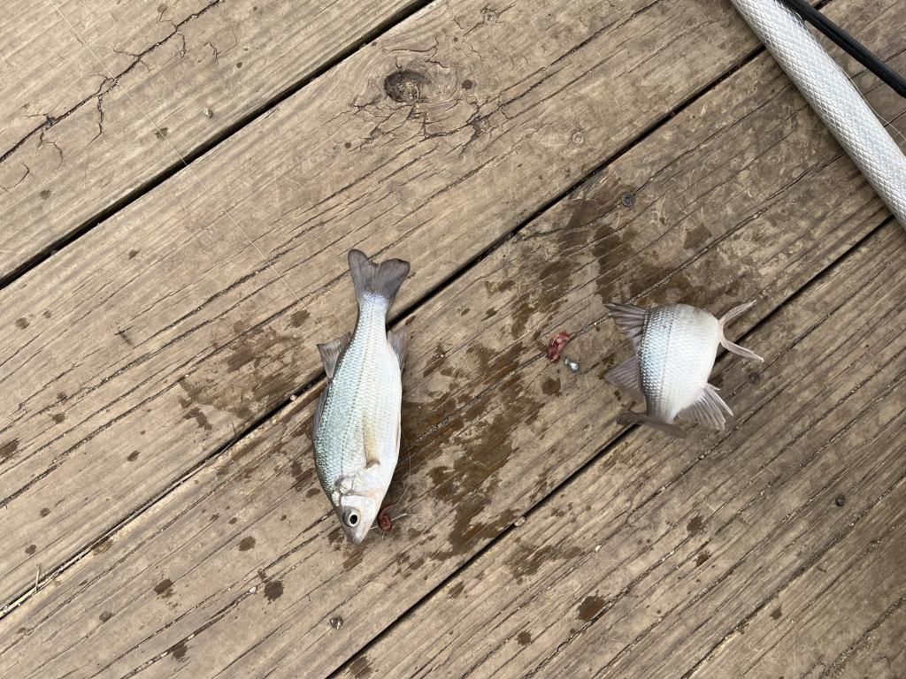 Went ultralight jigging in a frozen Central Jersey Lake this afternoon on a cloudy, cool day with a strong southwest wind. Got the last parking spot. More than 30 fishermen were there. Was fortunate to be able to fish near my spot in the huge crowd. Some fishermen were fishing in water holes in the ice. Fish were on the ice near the holes. Eagles were happy. Lucky for me that my spot wasn’t covered with ice. I caught and released 16 white perch including a double and 13 yellow perch with Walmart red worm halves on two gold hooks and an unpainted 1/32 oz leadhead jig on 4 lb test line. Landed 808 fish in 27 trips with 4 containers of worms 🪱 this year in the same spot. I let the unemployed landscapers use my net for a big white crappie again.