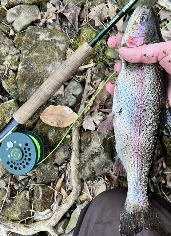 It has been a while since I pulled out the fly rod. Good news, it still works! Managed two rainbows in a shortened session Saturday morning. The bigger one had a hole on the other side of his mouth from being recently caught and released. Water levels in the creek were low and clear.