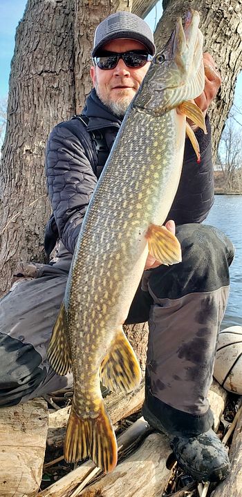 Got a late start with the daylight savings time stuff. That’s alright though, Pike seem to feed whenever they want. There is no time better then the other in my opinion. Cracked 2 nice fish yesterday on Shiners under a bobber. First fish was a solid female around 32ish, 2nd fish was a female as well but smaller, around 30ish. Healthy fish no doubt. They were peeling drag really good as well. Dan got his first ever Northern as well! Congrats Dan! Good times at Jurassic park! TIGHT LINEZ!