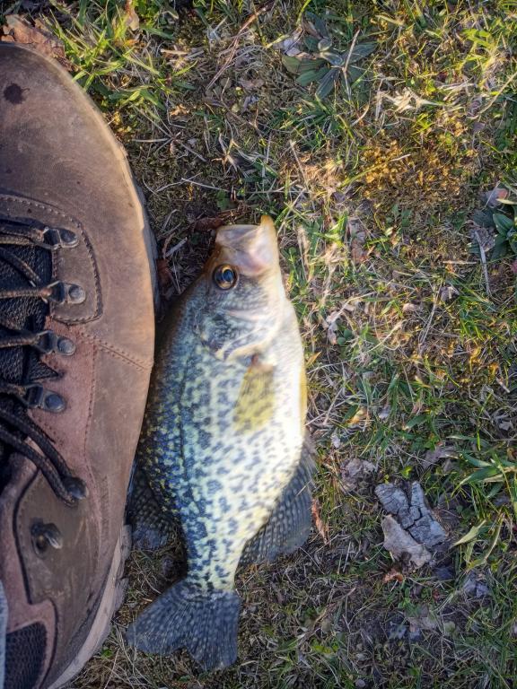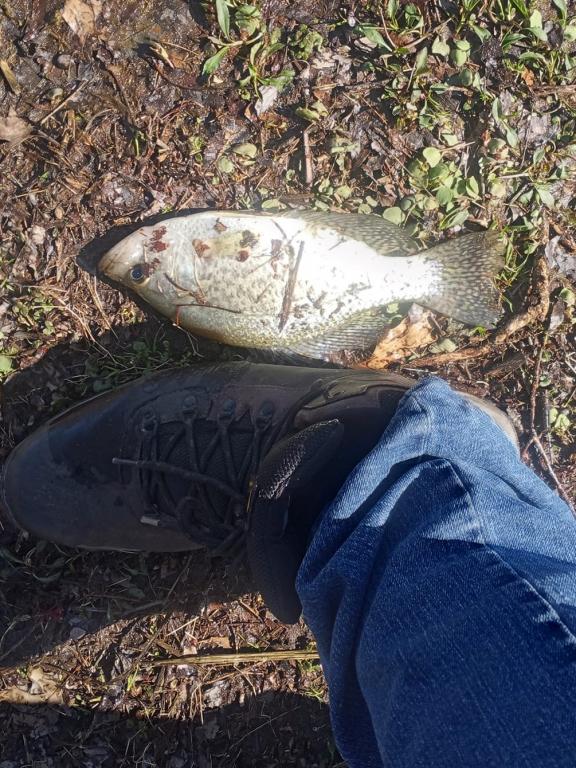 Had to pick something up for Dev in Bordentown Sunday so I hit up a pond which was about 6 minutes away on the map. Caught some sacalait & bluegill on the slippin float &jig. One sunfish had a little parasite on his chin, looked like the sea lice striped catfish get in the ocean. Couple 16eee boot pics for the float police. Nobody else there fishing & its in a beautiful little town.