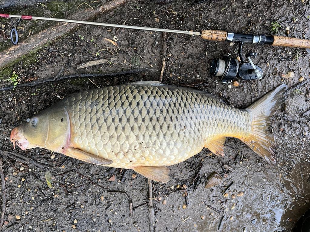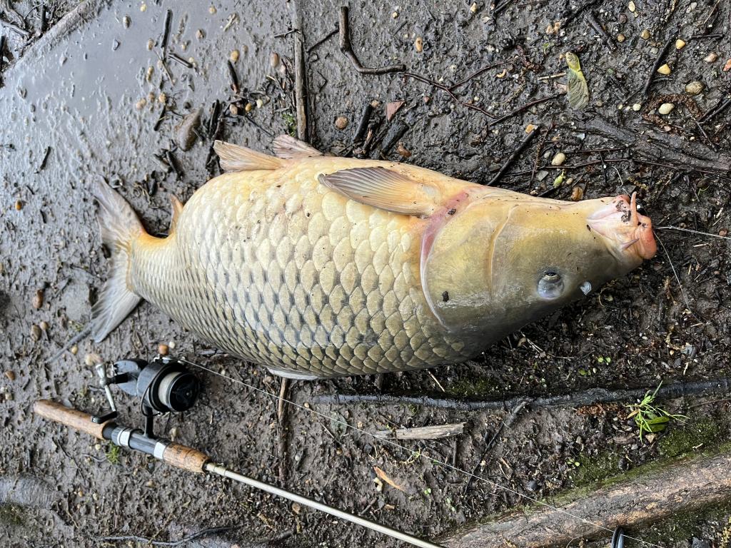 Went carping in flooded, muddy 56 degrees Carnegie Lake this evening in the cold rain during a small craft advisory sou’easter and flood warning. Looked like little China when I arrived. Nobody was there when I left. Didn’t bring my 2 lb test ultralight jigging outfit because of the muddy flood. Threw out a can of ShopRite extra crispy whole kernel corn, then had a good bite on my 4 lb test outfit. After I yanked and reeled in my line, two hooks were missing. I stopped fishing with two rods. On my last cast of the day with my 12 lb test outfit, I hooked something that acted like a snapping turtle. It made bubbles and didn’t fight. I reeled in halfway to shore between two candock fields before it started acting like a fish and made a run to my right. It swam into the candocks where two fish broke my 4 lb test line last week. I got lucky and by giving slack then applying maximum pressure was able to pull the fish out of the snags. Finally landed my biggest fish for this year, a 17.5 lb gravid female common carp. Gave her to Wendy’s again.