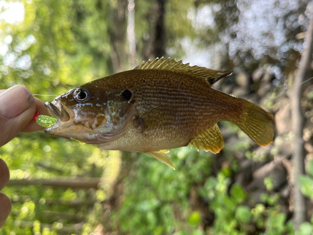 Went ultralight jigging in a 71 degree tidal tributary of a tributary of the Delaware River this evening on a warm, sunny day with a light west wind and low tide. Caught and released 60 red breasted sunfish, 2 bluegills, a green sunfish, a largemouth bass, a yellow perch and a white perch with 1/32 oz Big Eye jigs and 1” twister tails on 2 lb test line. Caught 1,630 fish in 113 NJ fishing 🎣 trips this year. Won a NJ Skillful Angler Recognition Award. Tagged 3 fish.