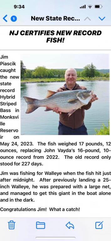 I recall that just before I retired from NJDF&W on 9/1/18, a very small number of hybrids were stocked in both Monksville and Splitrock Reservoirs along with publicity hyping anglers "to go out and get them!" Many of us thought it foolish,.........drops in the buckets of those big reservoirs,.....with no chance of anglers ever catching any. Who would have thunk it: 2 consecutive State Records from Monksville.