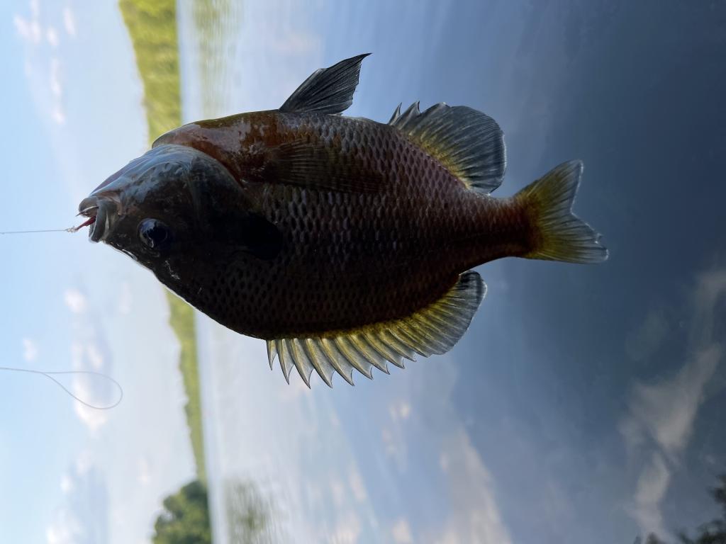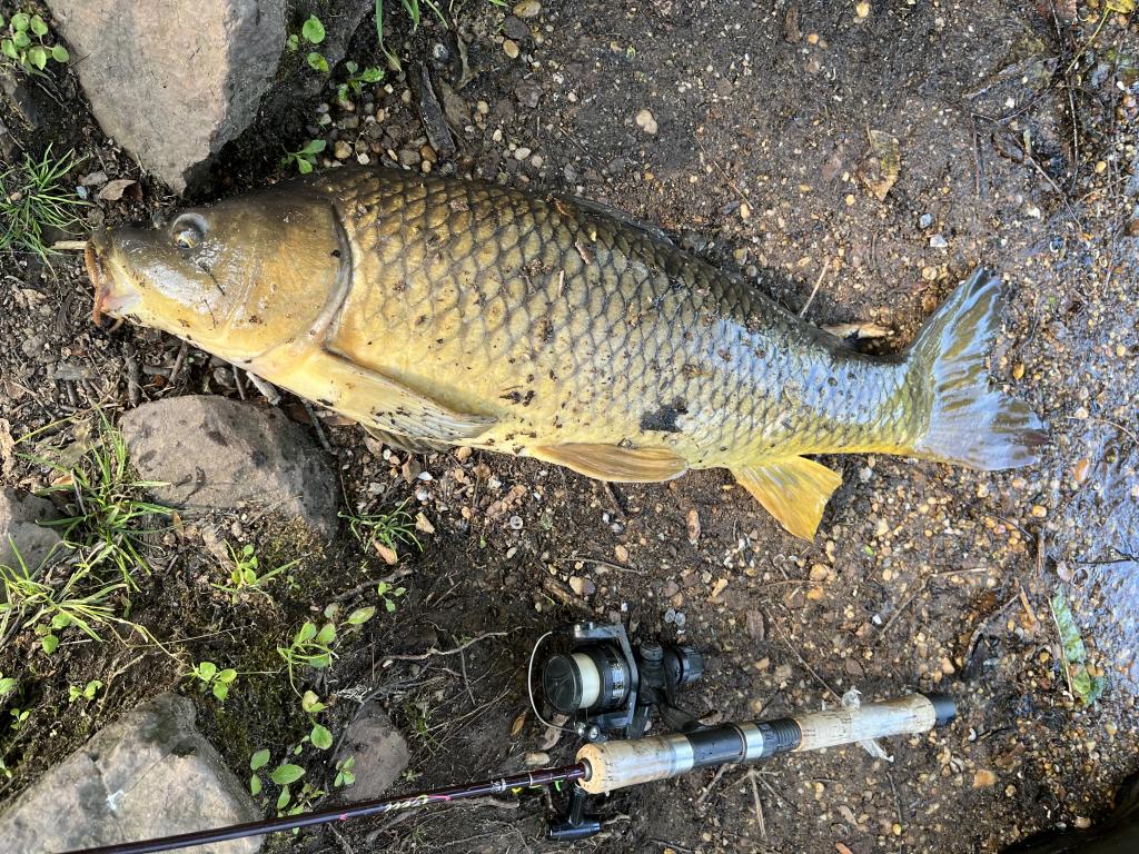 Went carping in 76 degree Carnegie Lake this evening on a warm, sunny day with a light south wind after a rain storm. Saw corn 🌽 in my primary spot. Threw out a can of corn for chum, then caught and released a yellow perch with a chartreuse 1/32 oz Big Eye jig and 1” chartreuse twister tail on 2 lb test line. Then landed an 11 lb milt leaking male common carp with ShopRite canned whole kernel corn 🌽 and brother John’s very old Shakespeare Alpha 50 spinning reel with no anti reverse. The carp made a very long run and I kept adjusting the drag because it was sticking. I was very fortunate that the line didn’t break. I like to back reel on big fish 🎣. Stopped ultralight jigging and fishing with corn, then caught and released three bluegills with my homemade corn meal bait on a #8 red treble hook and 12 lb test line. Gave the carp to Pablo from Ecuador. Caught 29 carp this year. Mosquitoes 🦟 were still biting.