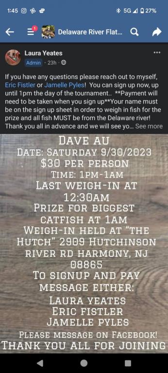 They are having a catfishing contest on the Delaware River September 30th with proceeds going to help Dave and a bunch of donated prizes for contestants. Contest runs out of "The Hutch" at 2909 Hutchinson River Rd., Harmony, NJ FROM 1PM 9/30 til 12:30am later that night. Main contact is Laura Yeats. Contest flier with contacts and info attached.