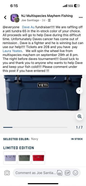 In addition, we are raffling off a big Yeti cooler with all proceeds going to Dave. "Tickets" are $20 each and there is no limit to how many you can buy. Each "ticket" gets your name on the random wheel one time, if you buy multiple tickets, that's how many times your name will go on the wheel! We will spin the wheel live on Friday the night before the contest at 8pm on the NJ Multispecies Mayhem facebook page. You do NOT need to have Facebook to win (you just won't get to see the live wheel spin). more information on this is also attached.